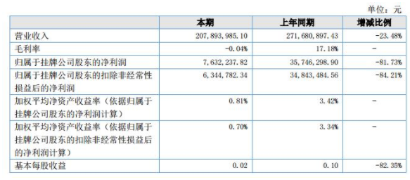 报告期实现营业收入20,789万元,同比下降23.5%;归属于股东的净利润为702万元,同比下降81.7%。