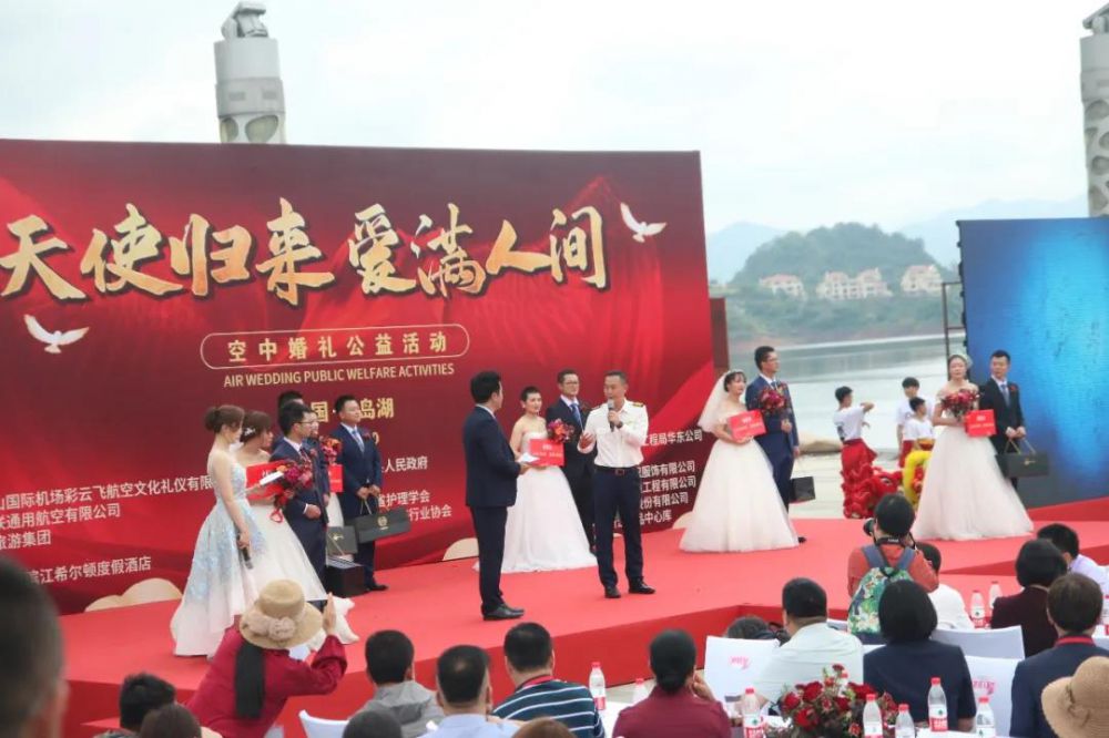 国际护士节前夕,5月10日上午10点,参与抗疫的6对新人在千岛湖珍珠广场参加“天使归来 爱满人间”空中婚礼。今天新人们穿上洁白的婚纱和帅气的西装,完成了人生中最重要的一场仪式,实现了“援鄂归来,我们就结婚”的愿望,兑现了爱的承诺,新娘乘座的新联通航直升机分别降落在婚庆现场,在亲朋好友的见证下,喜结连理,接纳祝福。